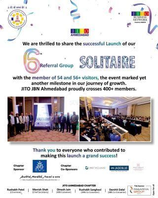 We are thrilled to share the successful launch of our 6th JBN Ahmedabad REFERRAL GROUP – “SOLITAIRE”With 54 dynamic members and 56+ enthusiastic visitors the event was a vibrant celebration of new beginnings.JITO JBN Ahmedabad proudly crosses 400+ members.Graced by the esteemed presence of all JITO & JBN dignitaries Kailashji Golechha, Ajayji Jain, Rushabh Patel, Sanjeev Chhajer, Alpesh Dholakia & Nitesh Shah this launch marked yet another milestone in our journey of growth, collaboration, and expanding connections.A heartfelt thank you to Rupen Shah, Dr. Ashil Shah, Rushabh Sanghavi, Darshit Dalal, Jenish Parikh and entire JBN Ahmedabad team who contributed to making this event a grand success!